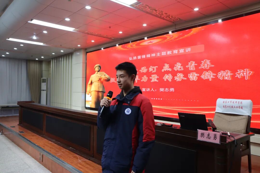 张家口雷锋精神志愿者服务队党支部书记樊志勇应邀作专题宣讲。他以雷锋同志一件件扎根人民、无私奉献的感人事迹为脉络,深刻阐释了雷锋精神“爱岗敬业、甘于奉献、助人为乐”的时代内核,引导青年学子将个人理想融入时代发展洪流。樊书记结合自身二十余年践行、传播雷锋精神的实践经历,讲述了576场公益活动背后守望相助、温暖人心的动人故事,以及雷锋精神教育基地以文化人、以德育人的丰硕成果。