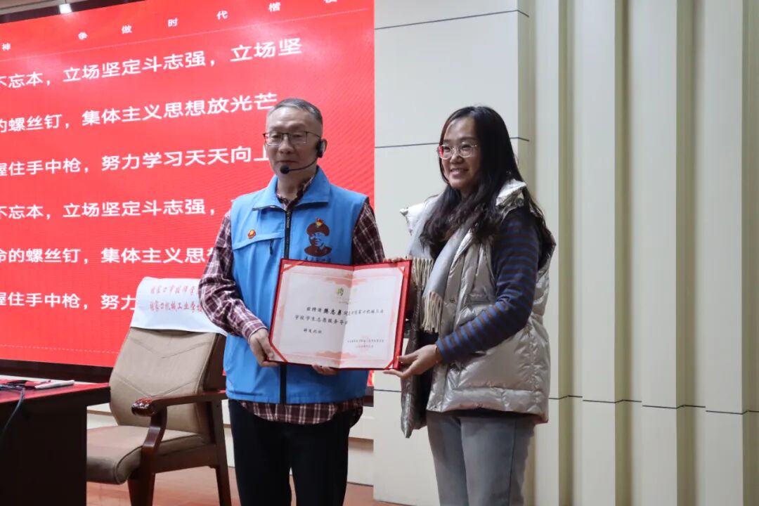 学校团委书记王蓓为樊志勇颁发聘书,正式聘请他担任学校志愿服务辅导员。